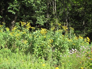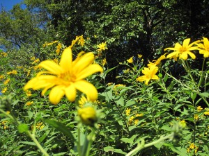 うちの敷地の一角で、キクイモの花が黄色い花を咲かせています。