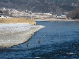 今日(2/16)から9月30日まで、店の前を流れる犀川の渓流釣りが解禁となり、