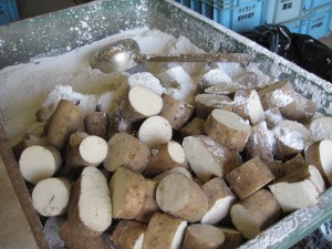 してきました。長芋を100g~120gに量って切って、菌がつかないよう石灰をつけて