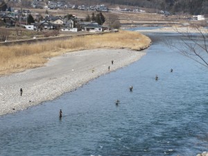 大勢の釣り人が、清流に釣り糸を垂らしていました。