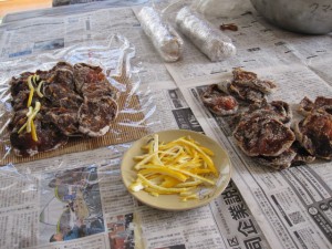 うちで作った干柿に、ゆずの皮を入れて巻いて作る「ゆず干柿」です。