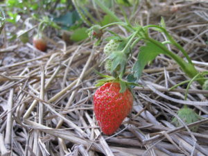 庭の片隅に植えたイチゴの苗を覗いてみたら、小さないちごの粒が数個